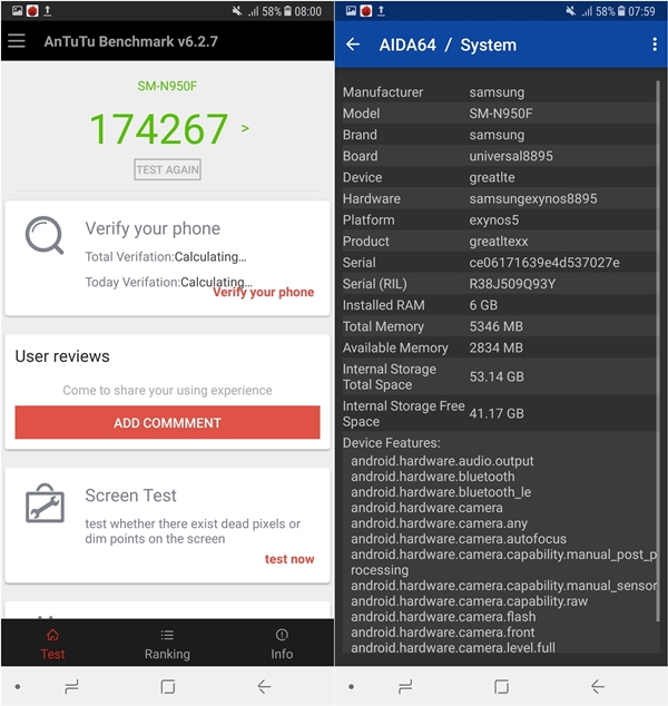ข้ามมาที่ประสิทธิภาพการทำงานกันซักหน่อย โดยแม้ว่า Samsung Galaxy Note 8 จะยังเลือกใช้ชิปเซ็ตประมวลผล Exynos 8895 เหมือนกับที่ติดตั้งเอาไว้บนซีรีส์ Samsung Galaxy S8 แต่ได้อัปเกรดหน่วยความจำ RAM ให้มากขึ้นเป็น 6GB เพื่อรองรับการใช้งานทางด้าน Multitasking และฟีเจอร์แบ่งหน้าจอแบบ Multi Windows นั่นเอง โดยเมื่อลองทดสอบประสิทธิภาพการทำงานโดยรวมของตัวเครื่องด้วยแอปพลิเคชัน AnTuTu ก็พบว่า สามารถทำคะแนนได้อยู่ในระดับแนวหน้าที่ประมาณ 174267 คะแนน