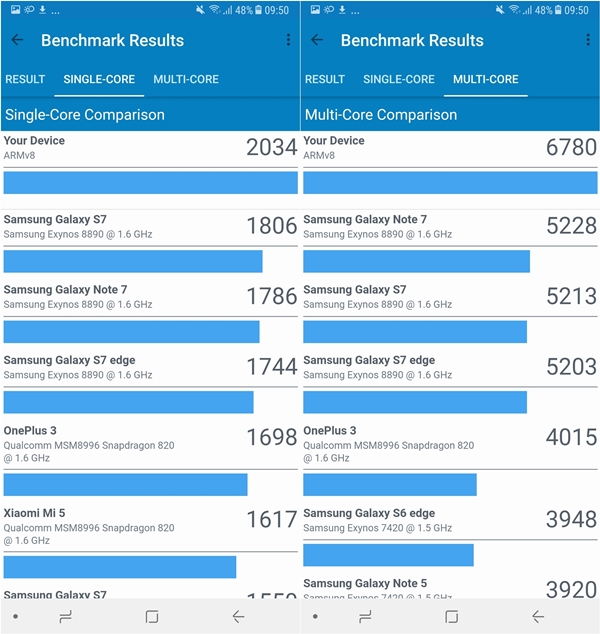 ทดสอบประสิทธิภาพการประมวลผลของตัวชิปเซ็ต ด้วยแอปพลิเคชัน Geekbench พบว่า สามารถทำคะแนนประมวลผลแบบ Single-Core ได้ที่ 2034 คะแนน และทำคะแนนประมวลผลแบบ Multi-Core ได้ที่ 6780 คะแนน