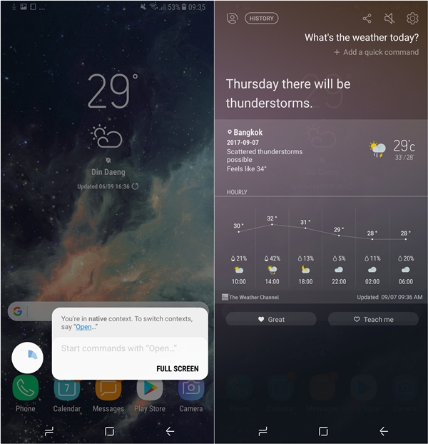 ส่วนทางด้านผู้ช่วยอัจฉริยะ Bixby นั้น ในตอนนี้เราสามารถสั่งการด้วยเสียงได้แล้ว เพียงแค่กดปุ่ม Bixby ค้างไว้ และออกคำสั่งได้เลยทันที เช่น ถามสภาพอากาศ หรือการสั่งให้เปิด-ปิดแอปพลิเคชันที่ต้องการ แต่ในขณะนี้ Bixby ยังรองรับคำสั่งเสียงแค่ภาษาอังกฤษ และภาษาเกาหลีเท่านั้น ซึ่งคาดว่าจะมีการอัปเดตภาษาอื่นๆ ให้ได้ใช้ในอนาคต