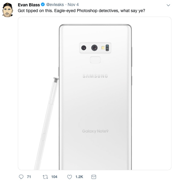 ถึงแม้ว่า Samsung Galaxy Note 9 มือถือเรือธงรุ่นล่าสุด จะวางจำหน่ายอย่างเป็นทางการแล้ว แต่ดูเหมือนว่าในอีกไม่กี่เดือนข้างหน้านี้ อาจจะมีการเพิ่มสีใหม่เข้ามา เพราะล่าสุด ทาง Evan Blass ต้นตอข่าวหลุดที่น่าเชื่อถือมากที่สุด ได้เผยภาพของ Samsung Galaxy Note 9 สีขาว ออกมาให้ชมกัน