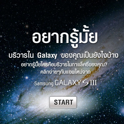 โดยในส่วนของซัมซุงประเทศไทย ได้มีการเปิดตัวแอพพลิเคชั่นใหม่ ในชื่อ “Galaxy App” ที่มาในรูปแบบของ Facebook Application และเพื่อให้สอดคล้องกับคอนเซ็ป The Next Galaxy แอพพลิเคชั่นดังกล่าวจึงได้รับการดีไซน์ออกมาให้เป็นเหมือนการจำลองกาแล็คซี่ส่วนตัวมาอยู่บนหน้า facebook ของคุณโดยสิ่งที่น่าสนใจของแอพนี้คือ จะมีการจัดกลุ่มเพื่อนใน facebook ของคุณให้เป็นกลุ่มดาวต่างๆ เช่น กลุ่มดาวกระจาย จะแทนเพื่อนที่ชอบเข้ามา tag รูปหรือข้อความต่างๆให้กับคุณ, กลุ่มดาว like แทนเพื่อนที่ชอบเข้ามากด like ทุกอย่างที่คุณ post, กลุ่มดาวหาง แทนเพื่อนที่นานๆ ครั้งจะโผล่เข้ามาเยี่ยมเยียน facebook ของคุณ และกลุ่มดาวอื่นๆ อีกมากมาย