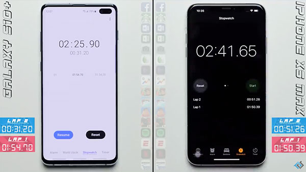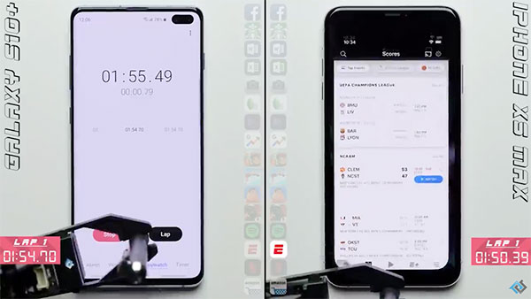 โดยการทดสอบจะแบ่งออกเป็น 2 รอบ กับการเปิดแอปพลิเคชันทั้งหมด 16 แอปฯ ซึ่งรอบแรกนั้น ปรากฏว่า iPhone XS Max ทำเวลาได้ดีกว่าที่ 1.50 นาที ส่วน Samsung Galaxy S10+ ช้ากว่าเพียงเล็กน้อยเท่านั้น ทำได้ 1.54 นาที