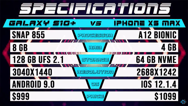 สำหรับ Samsung Galaxy S10+ รุ่นที่นำมาทดสอบนี้ มาพร้อมกับชิปเซ็ต Qualcomm Snapdragon 855, หน่วยความจำ RAM ขนาด 8 GB, หน่วยความจำ ROM ขนาด 128 GB และทำงานบนระบบปฏิบัติการ Android 9.0 (Pie) ส่วน iPhone XS Max มาพร้อมกับชิปเซ็ต Apple A12 Bionic, หน่วยความจำ RAM ขนาด 4 GB, หน่วยความจำ ROM ขนาด 64 GB และทำงานบนระบบปฏิบัติการ iOS 12