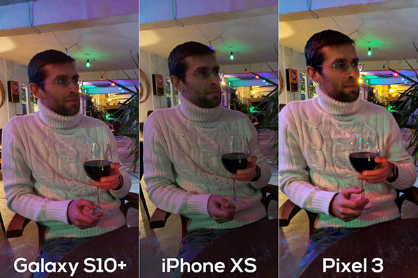 มาถ่ายภาพบุคคลในที่มีแสงไฟสลัวกันบ้าง อันที่จริงแล้วทั้ง 3 รุ่นก็ทำได้ไม่ดีเท่าที่ควร แต่ถ้าดูกันที่เรื่องของสีสัน Pixel 3 โดดเด่นกว่ารุ่นอื่นแต่ไม่สมจริง ส่วน iPhone XS ได้สีสันของภาพที่เหมือนของจริง ด้าน Samsung Galaxy S10+ ได้สีสันของภาพก้ำกึ่งระหว่าง 2 รุ่น