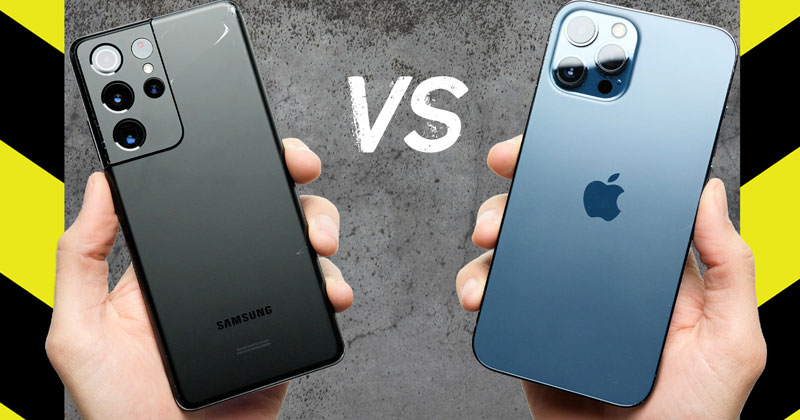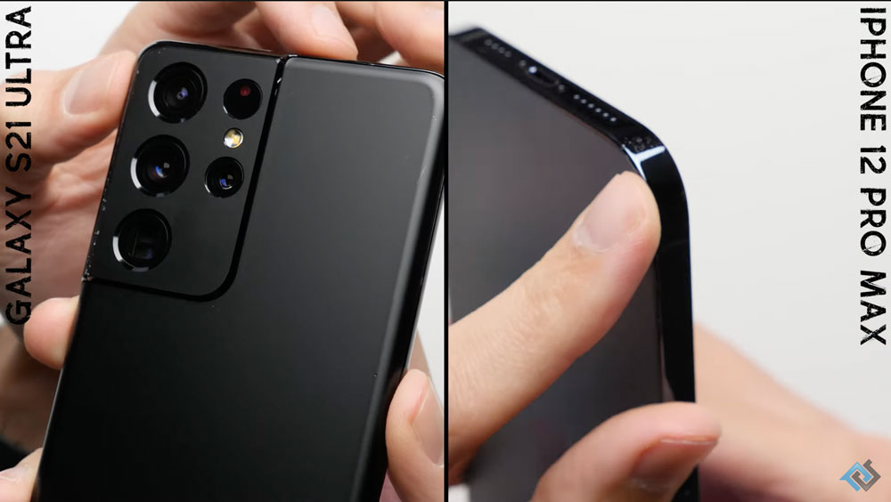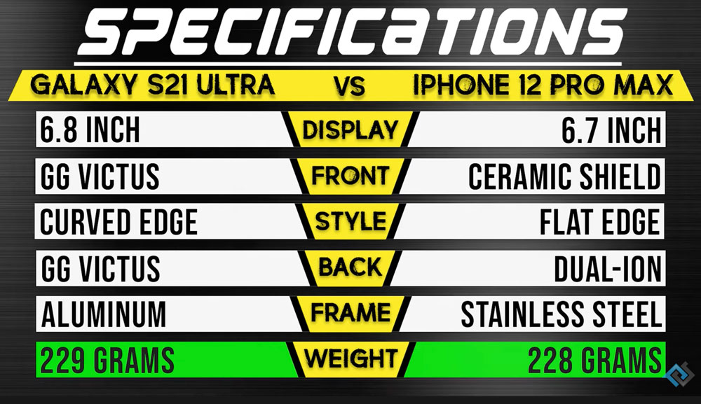 มาดูสเปกของทั้ง 2 รุ่นกันก่อน ซึ่ง Samsung Galaxy S21 Ultra (6.8 นิ้ว) นั้น มาพร้อมกับกระจกหน้าจอแบบ Gorilla Glass Victus ทั้งด้านหน้าและด้านหลัง ส่วนกรอบตัวเครื่องเป็นอะลูมิเนียมและขอบโค้ง ส่วน iPhone 12 Pro Max กระจกด้านหน้าเป็น Ceremic Shield, กระจกด้านหลังเป็น Dual-Ion และกรอบตัวเครื่องแบบ Stainless Steel ขอบแบน ในขณะที่น้ำหนักตัวเครื่องของทั้ง 2 รุ่นถือว่า ต่างกันไม่มากนัก