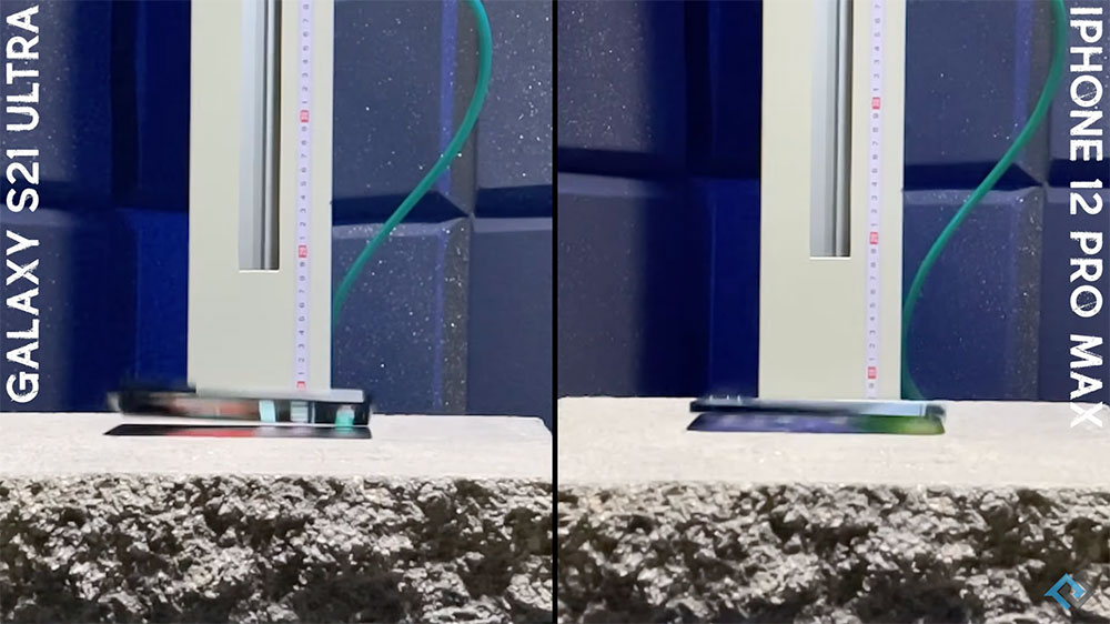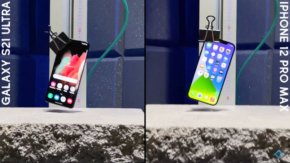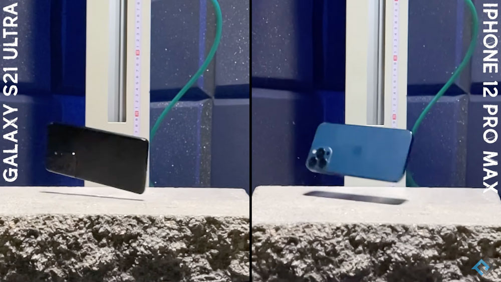 เริ่มการทดสอบแรกด้วยการปล่อยด้านหลังตัวเครื่องลงพื้นคอนกรีต ที่ระยะความสูง 1 เมตร ซึ่งด้านหลังตัวเครื่องของ iPhone 12 Pro Max ไม่มีรอยขีดข่วน ยกเว้นบริเวณขอบเครื่องที่มีรอยถลอกเล็กน้อย ส่วน Samsung Galaxy S21 Ultra มีรอยแตกบริเวณด้านบน มีรอยถลอกตรงโมดูลกล้อง และมีรอยขีดข่วนที่ด้านหลังเล็กน้อย