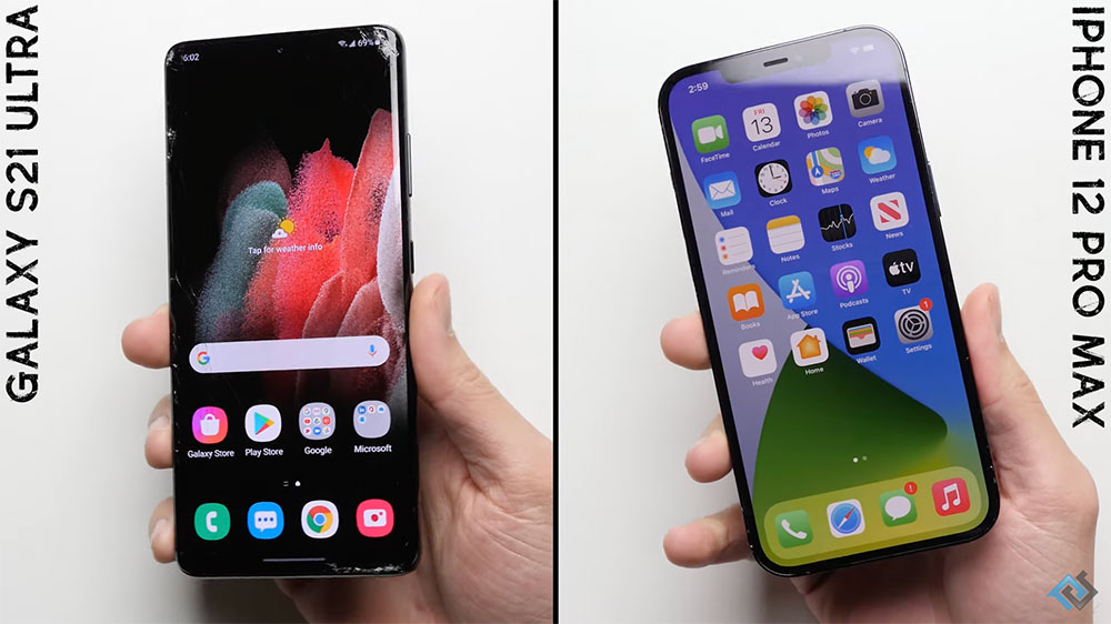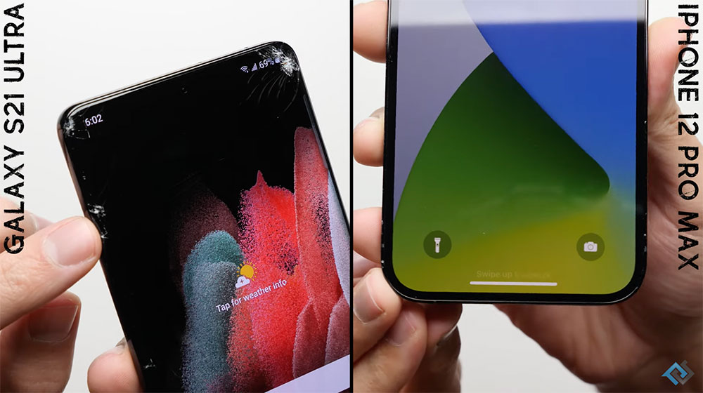 ล่าสุด PhoneBuff แชนแนลชื่อดังบน YouTube ได้เผยคลิปวิดีโอล่าสุด ซึ่งเป็นการทดสอบ Drop Test ทดสอบความแกร่งของตัวเครื่องและกระจกหน้าจอระหว่าง Samsung Galaxy S21 Ultra เรือธงรุ่นใหม่ป้ายแดง กับ iPhone 12 Pro Max เพื่อดูว่า รุ่นใดแกร่งกว่ากัน