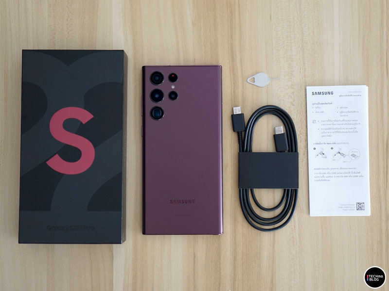 Samsung Galaxy S22 Ultra มาพร้อมกล่องแพ็กเกจสีดำ ด้านหน้าสกรีนตัวอักษร S สีเดียวกับตัวเครื่อง ภายในประกอบด้วย ตัวเครื่อง Samsung Galaxy S22 Ultra, สาย USB-C, เข็มสำหรับถอดถาดใส่ซิมการ์ด และคู่มือการใช้งาน ไม่มีหูฟังและ Adapter แถมมาให้