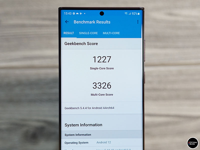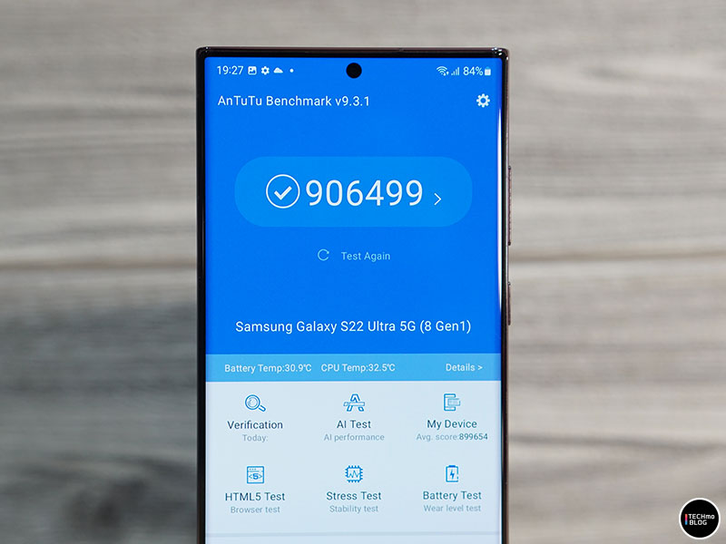 โดย Samsung Galaxy S22 Ultra รุ่นที่รีวิวนี้ เป็นรุ่นที่มาพร้อมกับหน่วยความจำ RAM ขนาด 12GB และหน่วยความจำ ROM ขนาด 256GB เมื่อทดสอบวัดประสิทธิภาพด้วยโปรแกรม AnTuTu พบว่า ได้คะแนนทดสอบถึง 906,499 คะแนน