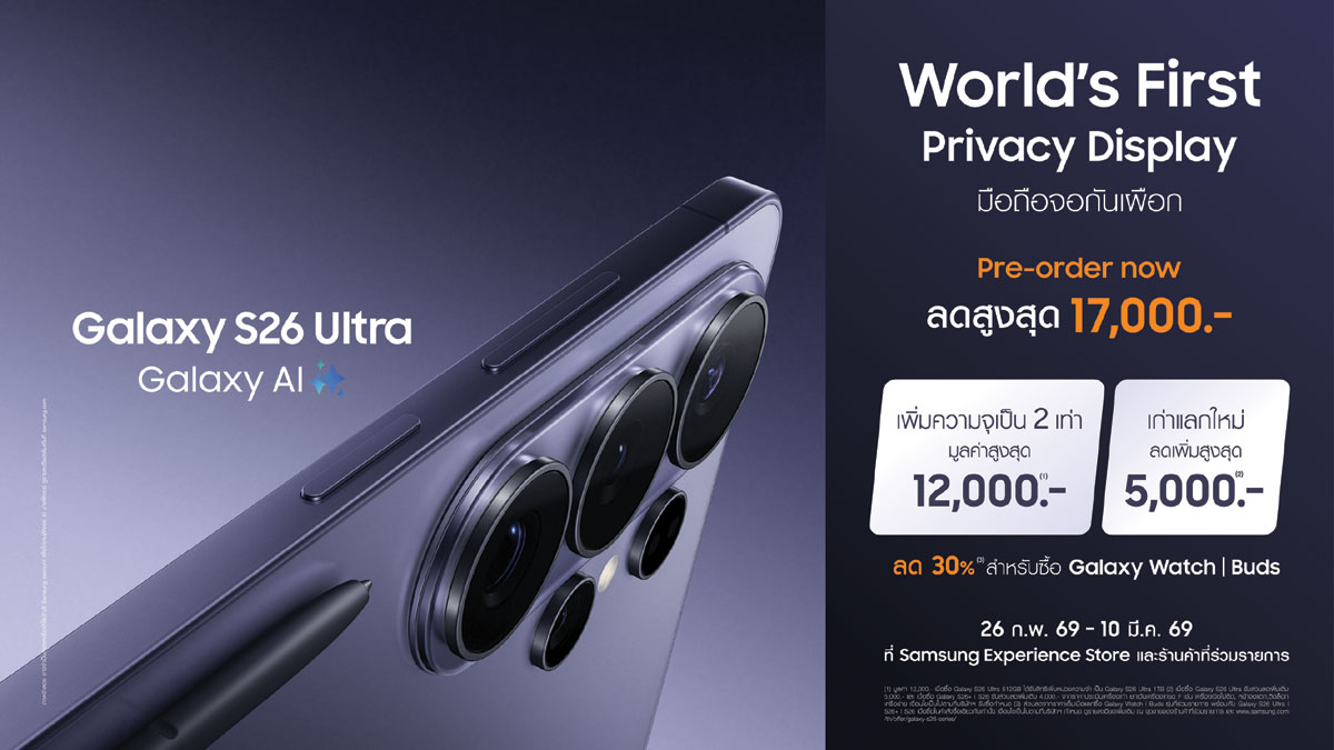 การใช้งานในทุกด้าน ทั้งการทำงาน ความบันเทิง และการถ่ายภาพ อัปเกรดกล้องใหม่ ภาพถ่ายที่คมชัดและ เก็บรายละเอียดได้ดียิ่งขึ้นในสภาพแสงน้อย สามารถพรีออเดอร์ได้ที่ Samsung Experience Store ร้านค้าที่ร่วมรายการ หรือช่องทางออนไลน์ https://smsngshop.com/s26-pr_buy พร้อมรับ โปรโมชันรวมมูลค่าสูงสุดถึง 17,000 บาท ตั้งแต่วันนี้ ถึง 10 มีนาคมนี้