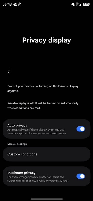 อีกหนึ่งระดับความปลอดภัยคือโหมด “Maximum Privacy” ที่จะลดความสว่างของหน้าจอให้มืดลงเมื่อเปิดใช้งาน เพื่อให้มองเห็นได้ยากยิ่งขึ้นสำหรับคนที่อยู่ข้าง ๆ