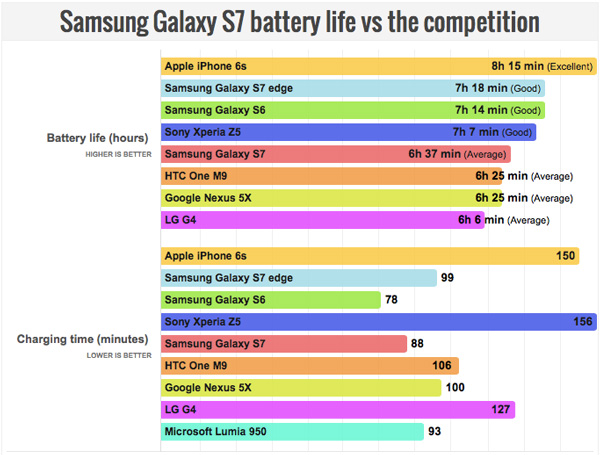 อย่างไรก็ดี ถึงแม้ว่า ผลการทดสอบด้านความอึดของแบตเตอรี่บน Samsung Galaxy S7 จะได้ผลที่ไม่น่าพอใจ แต่ในเรื่องของการชาร์จแบตเตอรี่ ก็ไม่เป็นรองใครเช่นกัน โดยใช้เวลาชาร์จเพียง 88 นาทีเท่านั้น เทียบกับ iPhone 6S ที่ใช้เวลาชาร์จถึง 150 นาทีเลยทีเดียว