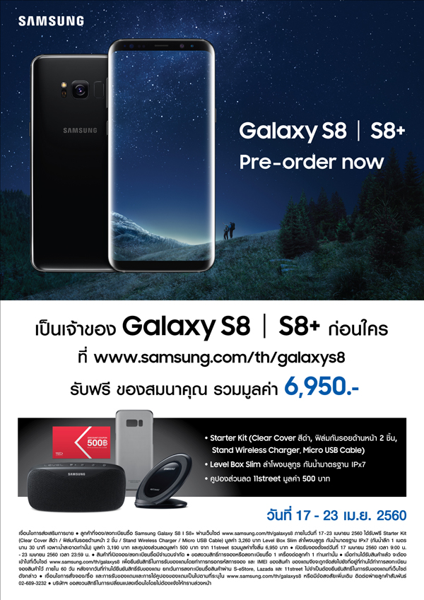 กรุงเทพ (17 เมษายน 2560) – ซัมซุงเปิดให้ผู้ที่สนใจในซัมซุงกาแลคซี่ เอส 8 และเอส 8+ สมาร์ทโฟนที่ได้รับความสนใจมากที่สุดในเวลานี้ ได้เป็นเจ้าของก่อนใคร โดยซัมซุงกาแลคซี่ เอส 8 64GB หน้าจอ 5.8” ราคา 27,900 บาท และ ซัมซุง กาแลคซี่ เอส 8+ 64GB หน้าจอ 6.2” ราคา 30,900 บาท พร้อมรับโปรโมชั่นสุดพิเศษ Premium Set มูลค่ารวม 6,950 บาท ผ่านช่องทางออนไลน์ของซัมซุงที่ www.galaxyunboxyourphone.com/ ตั้งแต่วันที่ 17 เมษายน เวลา 9.00 น. ถึงวันที่ 23 เมษายน เวลา 23.59 น. หรือที่สาขาซัมซุง ช้อปที่ร่วมรายการทั่วประเทศ พร้อมชมเครื่องจริงได้แล้ววันนี้
