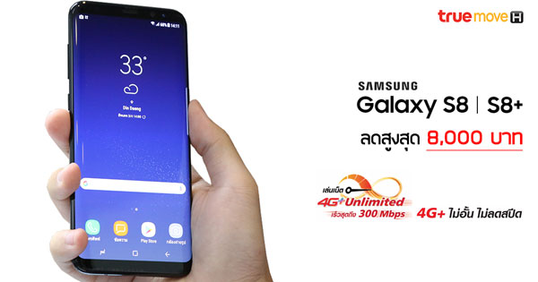 หลังจากที่ทาง ซัมซุง (ประเทศไทย) ได้เปิดตัว Samsung Galaxy S8 และ Samsung Galaxy S8+ อย่างเป็นทางการในไทยเมื่อไม่นานมานี้ ล่าสุด ทาง ทรูมูฟ เอช (TrueMove H) ได้ปล่อยโปรโมชั่นสุดพิเศษ รับส่วนลดค่าเครื่องสูงสุดถึง 8,000 บาท และย้ายค่ายมาทรูมูฟ เอช ลดค่าเครื่องเพิ่มอีก 1,000 บาท พร้อมรับสิทธิ์ใช้งานอินเทอร์เน็ต 4G+ Unlimited แบบไม่ลดสปีดที่ความเร็วสูงสุด 300 Mbps ซึ่ง ทรูมูฟ เอช เป็นรายแรกและรายเดียวที่มี 4×4 MIMO และ 3CA ทำให้สามารถเล่นเน็ต 4.5G ได้จริงทั่วไทย