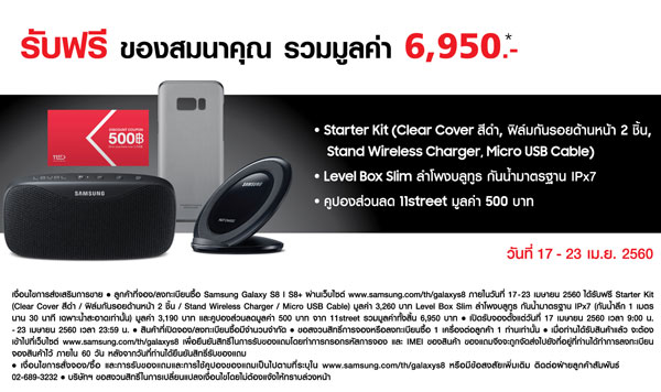 และสำหรับลูกค้าที่สั่งจอง Samsung Galaxy S8 กับ Samsung Galaxy S8+ จาก ทรูมูฟ เอช รับฟรีของสมนาคุณมูลค่า 6,950 บาท ซึ่งประกอบด้วย Starter Kit (Clear Cover สีดำ, ฟิล์มกันรอยด้านหน้า 2 ชิ้น, Stand Wireless Charger, microUSB Cable), Level Box Slim ลำโพงบลูทูธ กันน้ำมาตรฐาน IPx7 และคูปองส่วนลด 11street มูลค่า 500 บาท พร้อมรับสิทธิ์ผ่อนค่าเครื่อง 0% นานสูงสุด 20 เดือน (เฉพาะบัตรเครดิตที่ร่วมรายการ)