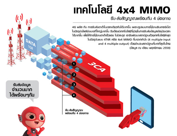ส่วนเทคโนโลยี 4x4 MIMO คือการรับส่งสัญญาณได้มากขึ้นพร้อมกัน 4 ช่องทาง ทำให้สามารถรับส่ง data ในเวลาเดียวกันได้จำนวนที่มากขึ้น และไม่มีสะดุด