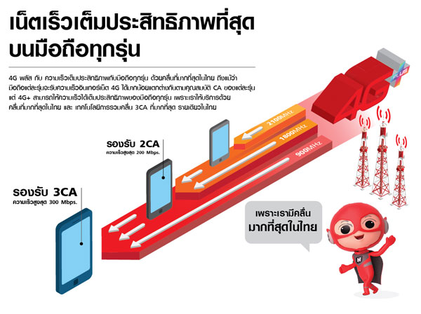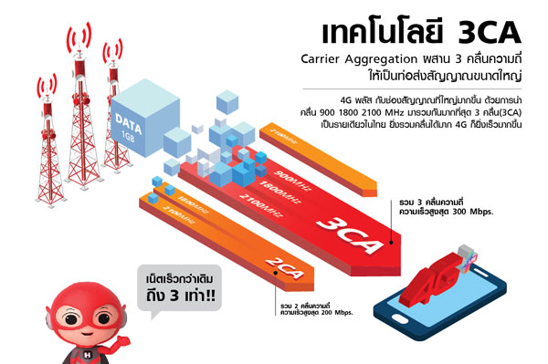 สำหรับเทคโนโลยี 3CA (Carrier Aggregation) คือการผสานคลื่นความถี่ 3 คลื่น ซึ่งได้แก่ คลื่นความถี่ 900 MHz, 1800 MHz และ 2100 MHz มารวมกันเป็นท่อส่งสัญญาณขนาดใหญ่ ให้ความเร็วสูงสุดถึง 300 Mbps ใช้งานอินเทอร์เน็ตได้เร็วกว่าเดิมถึง 3 เท่า