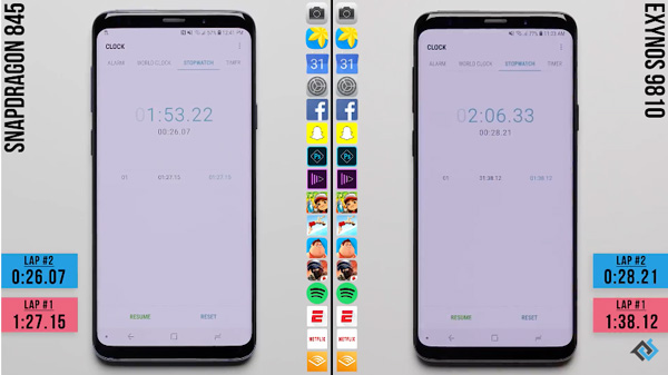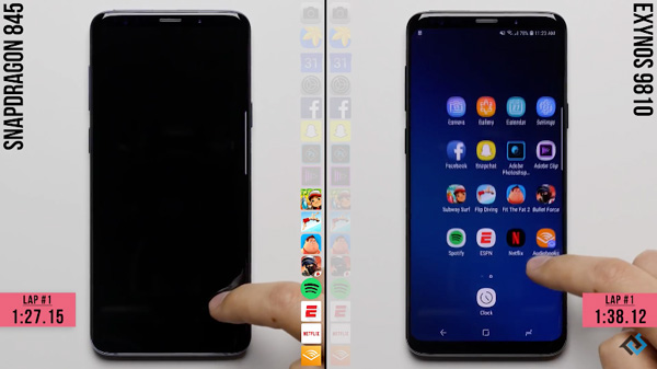 โดยทาง PhoneBuff แชนแนลบนเว็บไซต์ YouTube เจ้าเก่า ได้ทำการทดสอบเปรียบเทียบความเร็วในการเปิดแอปพลิเคชัน ระหว่าง Samsung Galaxy S9+ รุ่นที่ใช้ชิปเซ็ต Exynos 9810 กับชิปเซ็ต Qualcomm Snapdragon 845 โดยจะทำการเปิดแอปฯ ทั้งหมด 16 แอปฯ ซึ่งการทดสอบในรอบแรกจะเห็นว่า ทั้ง 2 ชิปเซ็ตประมวลผลได้เร็วสูสีกัน แต่เริ่มมีความแตกต่างกันช่วงเปิดแอปฯ เกม Subway Surf ที่ Samsung Galaxy S9+ รุ่นที่ใช้ชิปเซ็ต Snapdragon 845 ประมวลผลได้เร็วกว่าเล็กน้อย จบการทดสอบรอบแรก ปรากฏว่า รุ่นที่ใช้ชิปเซ็ต Snapdragon 845 ใช้เวลาไปทั้งสิ้น 1.27 นาที ส่วนรุ่นที่ใช้ชิปเซ็ต Exynos 9810 ใช้เวลาไปทั้งสิ้น 1.38 นาที