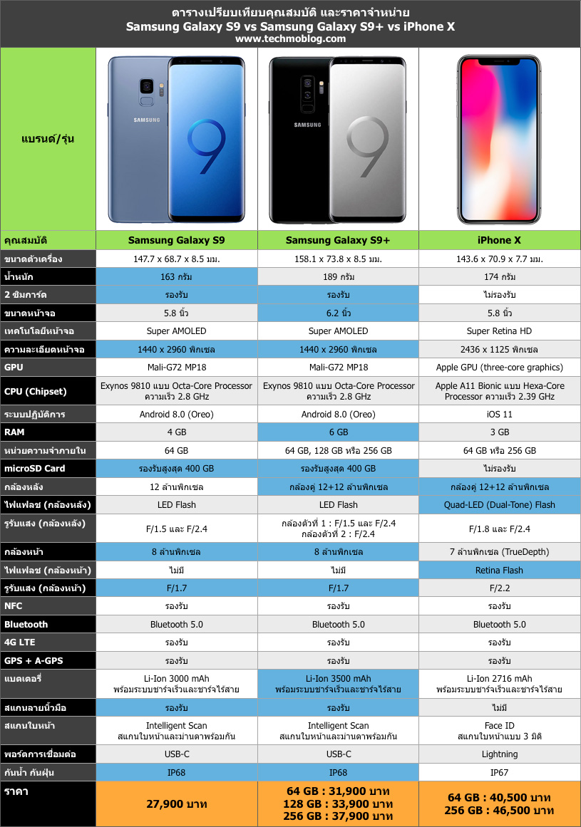 มาดูกันว่า ถ้าหากนำ Samsung Galaxy S9 และ Samsung Galaxy S9+ มาเปรียบเทียบกับมือถือคู่แข่งอย่าง iPhone X ที่มีจุดเด่นตรงกล้องคู่, Face ID ระบบสแกนใบหน้า รวมถึงเทคโนโลยี AR ทั้ง 3 รุ่นนี้จะมีความแตกต่างอย่างไรบ้าง