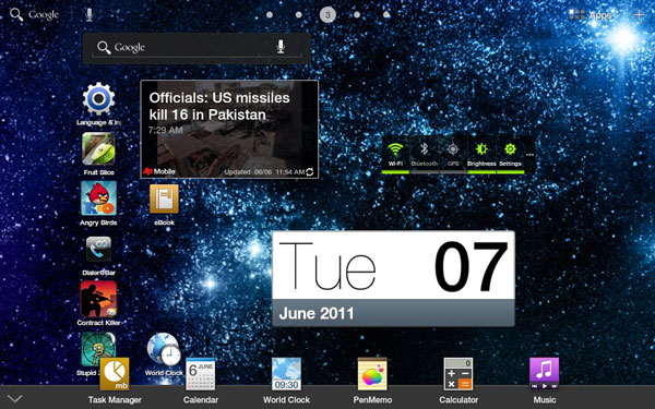 ในส่วนของ Notification Area ได้เปลี่ยนแปลงไปจากการลากจากบนลงล่าง ใน Android 2.2 Froyo ที่เราคุ้นเคยกันครับ มาเป็นการกดลงมุมล่างขวาแทนครับ ซึ่งจะมีทั้ง GPS, Wi-Fi, บลูทูธ และแจ้งเตือนถึงสิ่งที่เข้ามาใหม่ หรือกำลัง Install อยู่ อะไรประมาณนี้ครับ