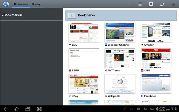 Samsung Galaxy Tab 8.9 คล้ายกับการใช้งาน Web Browser บนพีซีครับ มี Tab Bar, Bookmarks, History และสามารถเพิ่ม Tab ใหม่ได้โดยการกดที่เครื่องหมาย + ที่สำคัญคือ Samsung Galaxy Tab 8.9 รองรับการใช้งาน Flash อีกด้วยครับ