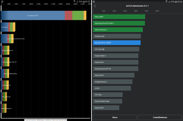 ปิดท้ายด้วยผลการทดสอบ Benchmark บน Samsung Galaxy Tab S2 9.7 กันบ้าง โดยผลการทดสอบด้วยโปรแกรม Quadrant วัดความเร็วในการทำงานของ CPU และกราฟฟิค อยู่ที่ 28,716 คะแนน และ AnTuTu ทดสอบ CPU, 2D & 3D graphics, SD card และ Database อยู่ที่ 44,599 คะแนน