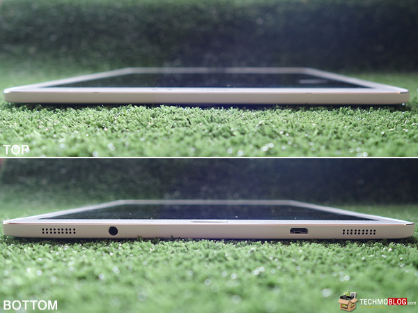 ด้านบนของตัวเครื่อง ไม่มีปุ่มควบคุมการทำงานเช่นกัน ส่วนด้านล่างของตัวเครื่อง เป็นลำโพงเสียงทั้งด้านซ้ายและขวา, ช่องหูฟังขนาดมาตรฐาน 3.5 มิลลิเมตร และพอร์ต microUSB
