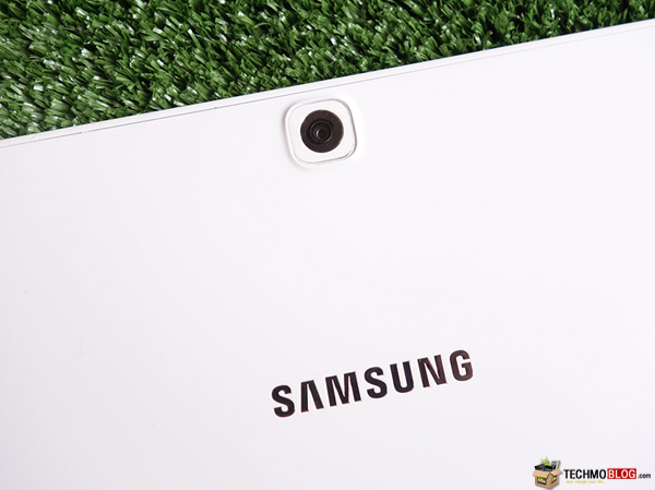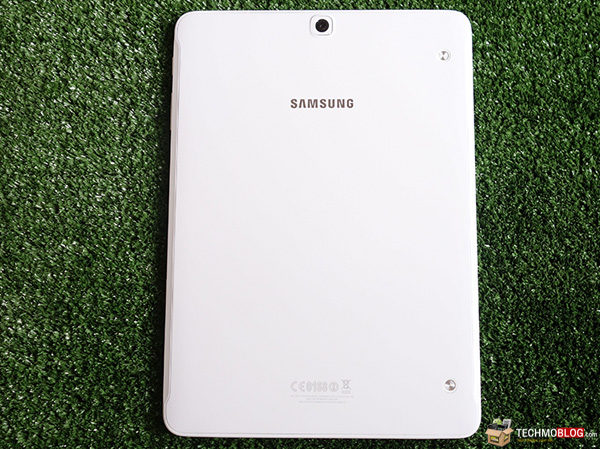 ด้านหลังของตัวเครื่อง ประกอบด้วย กล้องด้านหลัง ความละเอียด 8 ล้านพิกเซล พร้อมรูรับแสงกว้างสูงสุด F/1.9 ซึ่งตัวกล้องมีลักษณะนูนเล็กน้อย ส่วนปุ่มกลมๆ นั้น สำหรับเชื่อมต่อกับเคสนั่นเอง อย่างไรก็ดี Samsung Galaxy Tab S2 9.7 รุ่นนี้ ไม่สามารถถอดแกะฝาหลังได้
