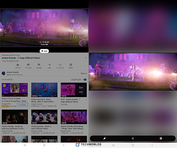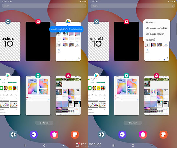 การกดค้างที่ไอคอนแอปฯ ในหน้า Recent Apps นั้น จะเป็นการเข้าสู่เมนูลัดของแอปฯ นั้น ซึ่งบางแอปพลิเคชัน อย่างเช่น YouTube สามารถเปิดใช้งานได้ทั้งแบบมุมมองหน้าจอแยก และมุมมองแบบ Pop-Up