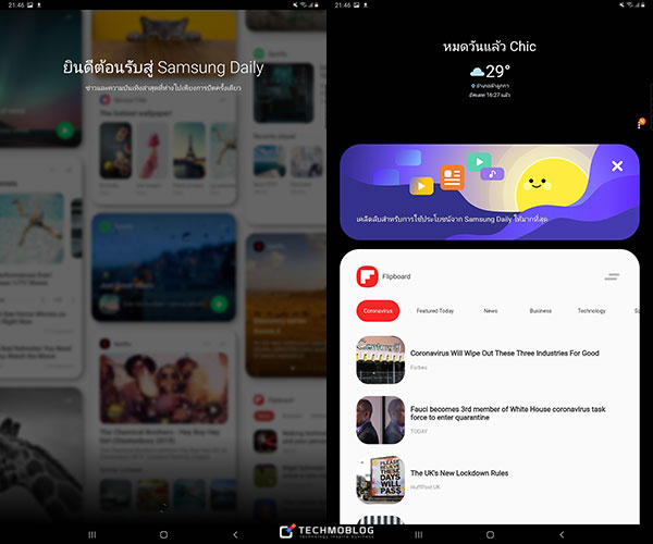 Samsung Daily (Bixby Home เดิม) เป็นฟีเจอร์ที่ประกอบด้วยคอนเทนต์ต่าง ๆ ที่ผู้ใช้ให้ความสนใจ รวมถึงข้อมูลและกิจกรรมต่าง ๆ ของผู้ใช้จะถูกรวมมาไว้ในหน้าเดียว เปิดใช้งานด้วยการปัดจากซ้ายไปขวา