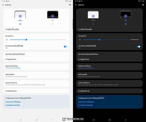 โหมดมืด จะเป็นการปรับเปลี่ยนธีมให้เป็นโทนสีดำ เพื่อให้ใช้งานได้สบายตาขึ้นในตอนกลางคืน ซึ่งผู้ใช้สามารถเปิด-ปิดใช้งานได้ด้วยตนเอง หรือตั้งเวลาเปิด-ปิดก็ได้เช่นกัน ด้วยการเข้าไปที่ การตั้งค่า > จอภาพ
