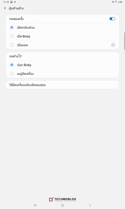 ปุ่มด้านข้าง (ปุ่ม Power) สามารถตั้งค่าการใช้งานได้ด้วยเช่นกัน ซึ่งการกดปุ่ม 2 ครั้ง จะเป็นการเปิดกล้องด่วน / เปิด Bixby / เปิดแอป ส่วนการกดค้าง จะเป็นการปลุก Bixby / ปิดเครื่อง สามารถเลือกได้ตามสไตล์การใช้งานของแต่ละคน