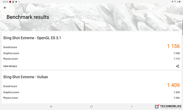 ทดสอบด้วยโปรแกรม 3D Mark กับการทดสอบแบบ Sling Shot Extreme - OpenGL ES 3.1 ได้คะแนนการทดสอบที่ 1,156 คะแนน และการทดสอบแบบ Sling Shot Extreme - Vulkan ได้คะแนนการทดสอบที่ 1,409 คะแนน