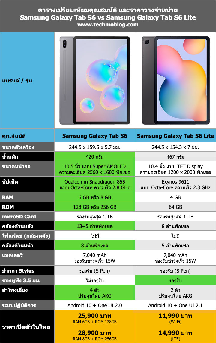 สำหรับ Samsung Galaxy Tab S6 Lite รุ่นที่วางจำหน่ายในไทย จะมีให้เลือก 2 รุ่น นั่นก็คือ รุ่น Wi-Fi ราคา 11,990 บาท มีให้เลือก 3 สี ได้แก่ Oxford Gray, Chiffon Pink และ Angora Blue กับรุ่น 4G LTE (รุ่นที่รีวิว) ราคา 14,990 บาท มีให้เลือก 2 สี ได้แก่ ได้แก่ Oxford Gray และ Angora Blue