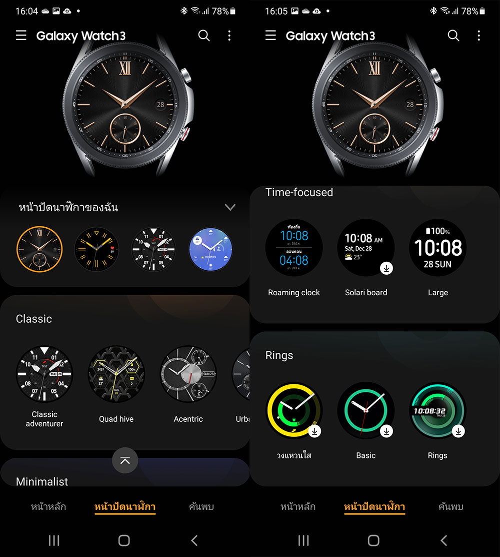 หน้าปัดนาฬิกาของ Samsung Galaxy Watch3 LTE มีให้เลือกมากมายหลายรูปแบบ แบ่งเป็น 8 หมวดหมู่ด้วยกัน ได้แก่ Classic, Minimalist, Trendy, Informative, Health, Wallpaper, Time-Focused และ Rings ซึ่งในแต่ละหมวดหมู่ ก็จะมีแบบย่อย ๆ ให้เลือกอีกมากมายตามสไตล์การใช้งาน