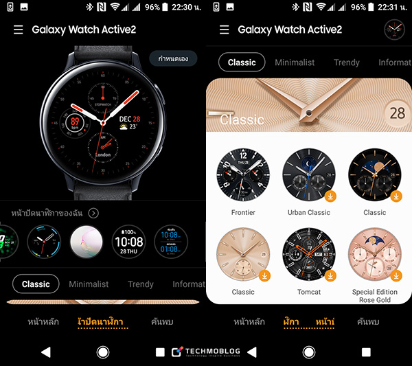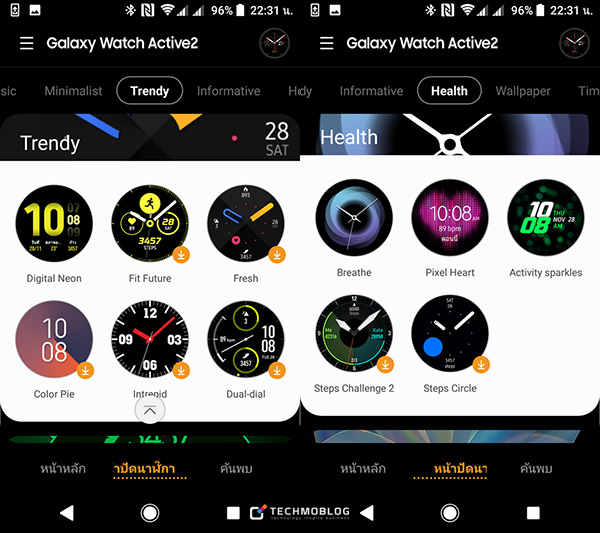 หน้าปัดนาฬิกาของ Samsung Galaxy Watch Active 2 มีให้เลือกมากมายหลายรูปแบบ แบ่งเป็น 9 หมวดหมู่ด้วยกัน ได้แก่ Classic, Minimalist, Trendy, Informative, Health, Wallpaper, Time-Focused, Rings และรูปแบบแนะนำ ซึ่งในแต่ละหมวดหมู่ ก็จะมีแบบย่อย ๆ ให้เลือกอีกมากมายตามสไตล์การใช้งาน