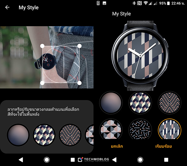 อีกหนึ่งลูกเล่นที่น่าสนใจของรูปแบบหน้าปัดบน Samsung Galaxy Watch Active 2 ก็คือ My Style กับหน้าปัดนาฬิกาแบบ Abstract ที่สามารถเปลี่ยนให้เข้ากับสไตล์การแต่งตัวในแต่ละวันของผู้ใช้ได้ ด้วยการเข้าไปที่เมนูหน้าปัดนาฬิกา แล้วเลือก My Style จากนั้นถ่ายรูปเสื้อผ้าที่ใส่ในวันนั้น ๆ ระบบจะทำการเลือกคู่สีพร้อมกับแพทเทิร์นหน้าปัดให้เลือก เรียกได้ว่า เป็นลูกเล่นที่แปลกและไม่เหมือนใคร