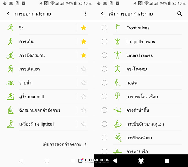 นอกจากนี้ ยังมีตัวเลือกการออกกำลังกายให้เลือกมากมายกว่า 90 รูปแบบ อีกทั้งยังมาพร้อมโหมดติดตามการออกกำลังกายอัตโนมัติได้ถึง 7 แบบ ได้แก่ เดิน, วิ่ง, ปั่นจักรยาน, พายเรือ, ว่ายน้ำ, เครื่องเล่น Elliptical Trainer และการออกกำลังกายอื่น ๆ (ตัวที่ติดดาว) นอกเหนือจากนี้จะต้องกดเริ่มและหยุดติดตามเอง