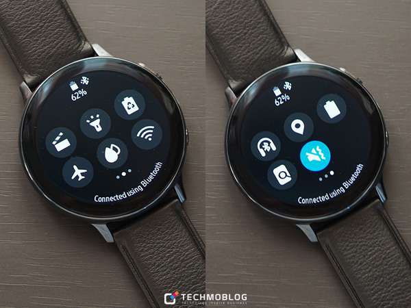 มาดูอินเทอร์เฟสการใช้งานบน Samsung Galaxy Watch Active 2 กันบ้าง โดยการปัดลงจากด้านบน จะเป็นเมนูลัดต่าง ๆ ไม่ว่าจะเป็น โหมด Goodnight, ปรับความสว่างของหน้าจอ, โหมดห้ามรบกวน, ไฟฉาย และอื่น ๆ ซึ่งในส่วนนี้จะบอกปริมาณแบตเตอรี่ที่เหลืออยู่ด้วยเช่นกัน