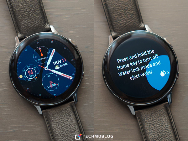 สำหรับ Samsung Galaxy Watch Active 2 รุ่นที่นำมารีวิวในวันนี้ เป็นตัวเรือนสแตนเลส สีดำ หน้าปัดขนาด 44 มิลลิเมตร พร้อมสายหนัง ซึ่งตัวเครื่องมาพร้อมกับคุณสมบัติในการกันน้ำและฝุ่นที่ระดับ IP68 และ 5ATM สามารถใส่ว่ายน้ำได้ แต่ไม่เหมาะกับการใส่ดำน้ำ หรือกิจกรรมที่มีแรงดันน้ำสูง นอกจากนี้ ยังมาพร้อมกับความทนทานระดับ MIL-STD-810G ซึ่งเป็นมาตรฐานของทางกองทัพสหรัฐฯ อีกด้วย