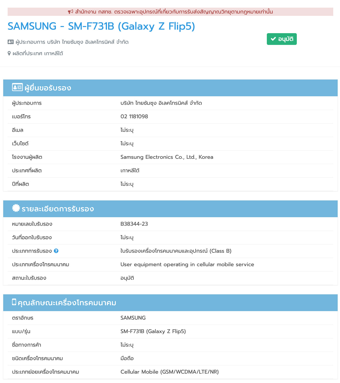 โดย Samsung Galaxy Z Flip5 รุ่นที่จะนำมาขายในไทย เป็นโมเดล SM-F731B หรือ Galaxy Z Flip5 ซึ่งการอนุมัติจากทาง กสทช. นี้ เป็นการยืนยันว่า ประเทศไทยจะเป็นกลุ่มประเทศแรกที่วางจำหน่าย Galaxy Z Flip5 นั่นเอง
