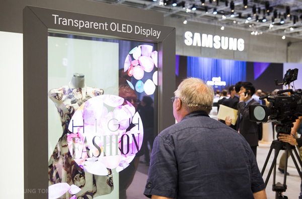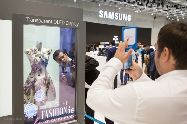 เบอร์ลิน, เยอรมนี – 8 กันยายน 2015 – ซัมซุงนำเสนอมิติใหม่แห่งการช้อปปิ้งในอนาคต ด้วยหน้าจอโปร่งแสงแบบ OLED (T-OLED) ขนาด 55 นิ้ว เป็นหนึ่งในนวัตกรรมหน้าจอที่ได้รับความสนใจจากผู้เยี่ยมชมงาน IFA 2015 หน้าจอดังกล่าวนี้ถือเป็นหน้าจอแบบโปร่งแสงรุ่นแรกสำหรับการใช้งานเชิงพาณิชย์ หน้าจอนี้สรรสร้างขึ้นเพื่อการนำเสนอผลิตภัณฑ์หน้าร้านอย่างสวยงามสะดุดตา อีกทั้งยังสามารถใช้เป็นหน้าจอสำหรับการแสดงภาพโฆษณาให้เต็มตากว่าที่เคย หน้าจอนี้สามารถแสดงภาพนิ่งหรือภาพเคลื่อนไหวต่างๆ ได้ โดยการแสดงผลภาพจะไม่ถูกรบกวนแม้จะมีคนหรือวัตถุใดๆ อยู่ด้านหลังหน้าจอก็ตาม หน้าจอโปร่งแสงแบบ OLED รองรับการสัมผัสและยังมีลำโพงมาในตัวเพื่อดึงดูดและเติมเต็มประสบการณ์การจับจ่ายของลูกค้าก่อนที่พวกเขาจะก้าวเข้ามาในร้านค้า