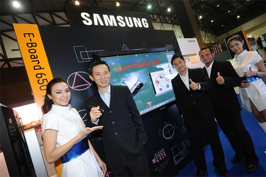“ล่าสุดซัมซุงได้เปิดตัว อี-บอร์ด (E-Board) รุ่น 650TS ขนาด 65 นิ้ว เป็นครั้งแรกในประเทศไทย ซึ่งเหมาะสำหรับการใช้งานที่ต้องอาศัยการนำเสนองานอย่างมืออาชีพ โดยเฉพาะธุรกิจด้านการศึกษา ด้วยหน้าจอแบบสัมผัสที่สามารถเขียน ลบทิ้ง หรือเก็บข้อมูลได้อย่าง่ายดาย เชื่อมต่อคอมพิวเตอร์และอินเทอร์เน็ต นำเสนอภาพนิ่งและวิดีโอทั้งยังสามารถเขียนลงบนหน้าจอขณะฉายวิดีโอได้ และมีฟังก์ชันสนับสนุนการเรียนการสอน และการประชุม โดยซัมซุงมั่นใจว่าการใช้อี-บอร์ดจะเป็นที่นิยมอย่างแพร่หลายในอนาคตอันใกล้ เนื่องจากสามารถตอบโจทย์ความต้องการและรองรับการใช้งานระดับมืออาชีพ โดยได้แต่งตั้งตัวแทนจำหน่าย บริษัท คอมพิวเตอร์ยูเนี่ยน เป็นพันธมิตรธุรกิจ เพื่อการจัดจำหน่ายอี-บอร์ด”