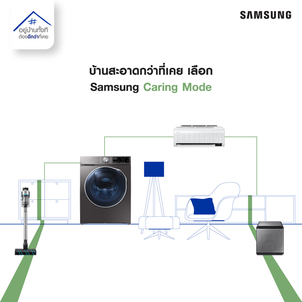 สำหรับสายคลีน Caring Mode บ้านสะอาดกว่าที่เคย มาช่วยทั้งแม่บ้านมือใหม่และมือฉมัง ด้วยเครื่องซักผ้า Combo ที่ขจัดเชื้อแบคทีเรียด้วยระบบซัก Hygiene Steam อบผ้าแห้งด้วย Air wash หมดกังวลกับสิ่งสกปรกจากการตากผ้านอกบ้าน พร้อม Add Wash™ ประตูเติมผ้าได้ระหว่างซัก และ AI Q-rator ที่ควบคุมง่ายผ่านแอป SmartThings บนโทรศัพท์มือถือ ฟังก์ชั่นครบ สะดวก ทำให้ลืมไปเลยว่าเรื่องซักเป็นงานบ้าน หากจะกวาดถูบ้านก็รวดเร็วยิ่งกว่าด้วยเครื่องดูดฝุ่นไร้สาย Samsung Jet™ ด้วยแรงดูดทรงพลังให้คุณเหนื่อยน้อยลง และมั่นใจกับอากาศที่บริสุทธิ์ไปอีกขั้นด้วยเครื่องฟอกอากาศซัมซุง Cube ที่สามารถขจัดฝุ่นอนุภาคเล็ก PM0.3 ได้มากถึง 99.9% ดักจับฝุ่นละเอียดและสารก่อภูมิแพ้ และสบายใจได้เลยกับการดูแลอากาศแบบ 3 ชั้น Tri-Care Filter ของเครื่องปรับอากาศติดผนัง Wind-Free™ ที่ดักจับฝุ่นละเอียด พร้อมขจัดไวรัส แบคทีเรีย และสารก่อภูมิแพ้ต่าง ๆ ให้คุณอุ่นใจ หายห่วงเรื่องความสะอาดได้เลย