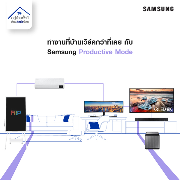 สายสู้งาน Productivity Mode - ทำงานที่บ้านเวิร์คกว่าที่เคย ด้วยเครื่องใช้ไฟฟ้าซัมซุงที่มาเสริมศักยภาพการทำงานกันอย่างเต็มที่ ไม่ว่าจะเป็น Curved Monitor จอโค้งไร้ขอบ ตอบโจทย์การทำงานทุกรูปแบบ จะประชุมผ่านวีดีโอคอล ทำงานเอกสาร กราฟฟิกหรือตัดต่อวีดีโอ ก็ให้คุณนั่งทำงานได้อย่างสบายตา หรืออีกขั้นของความคมชัดระดับ 8K ของซัมซุง QLED TV ที่มาพร้อม Quantum Processor 8Kและ AI Upscaling ก็ให้ประสบการณ์สมจริงสมบูรณ์แบบ เสริมด้วยเครื่องกรองอากาศ Blue Sky ดีไซน์โดดเด่นรางวัล iF Design กรองฝุ่นอนุภาคเล็กได้ถึง PM0.3 พร้อมเปิดแอร์ Wind-FreeTM ให้คุณเย็นสบายได้ตลอดวัน และยังประหยัดพลังงานได้ถึง 77% ไม่ต้องกังวลเรื่องค่าไฟ ทั้งยังควบคุมได้ง่ายผ่านแอป SmartThings อีกด้วย ทั้งหมดนี้ช่วยให้คุณมีสมาธิทำงานได้ต่อเนื่องลื่นไหลและมีประสิทธิภาพเต็มที่มากยิ่งขึ้นตลอดวัน