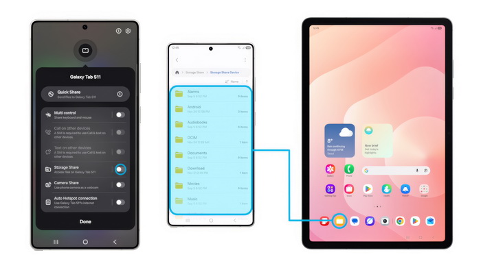 Storage Share4 ช่วยให้การใช้งานในระบบ Galaxy ecosystem ราบรื่นยิ่งขึ้น โดยสามารถดูไฟล์จากอุปกรณ์ Galaxy เครื่องอื่น เช่น แท็บเล็ตหรือพีซี ได้โดยตรงผ่านแอป My Files และยังเข้าถึงไฟล์บนสมาร์ทโฟนจากอุปกรณ์ซัมซุงอื่น ๆ ได้ด้วย รวมถึงบนทีวี