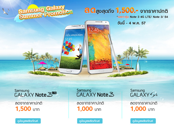 ซัมซุง จัดโปรโมชั่น สมาร์ทโฟนในตระกูล Galaxy ราคาพิเศษสุดๆ ต้อนรับอากาศที่ร้อนระอุ กับ Samsung Galaxy Summer Promotion ที่ได้นำ Samsung Galaxy รุ่นยอดฮิต 3 รุ่น มาลดราคากันแบบสุดๆ ไม่ว่าจะเป็น Samsung Galaxy Note 3 LTE ลดจากราคาปกติ 1,500 บาท และ Samsung Galaxy Note 3 กับ Samsung Galaxy S4 ลดจากราคาปกติ 1,000 บาท