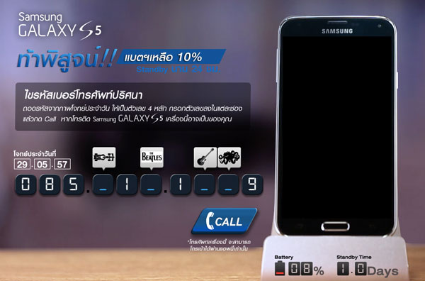 อยากได้ Samsung Galaxy S5 มาใช้แบบฟรีๆ ฟังทางนี้!! ล่าสุด ซัมซุง ประเทศไทย มีกิจกรรมให้ สาวกซัมซุง มาร่วมพิสูจน์ โหมดประหยัดพลังงาน บน Samsung Galaxy S5 แม้จะเหลือแบตฯ แค่ 10% แต่ก็ยังใช้งานได้นาน 10 ชั่วโมง พร้อมกับร่วมไขรหัสเบอร์โทรศัพท์ปริศนา ด้วยการถอดรหัสจากภาพโจทย์ประจำวัน ให้เป็นตัวเลข 4 หลัก กรอกตัวเลขในแต่ละช่อง แล้วกด Call หากโทรติด Samsung Galaxy S5 เครื่องนี้ อาจเป็นของคุณ!