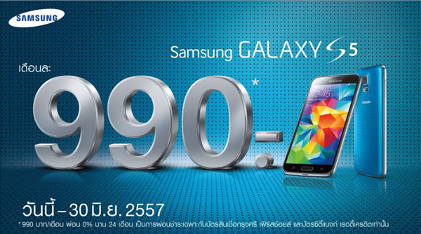 ซัมซุงมอบข้อเสนอสุดร้อนแรงให้ทุกคนได้เป็นเจ้าของสมาร์ทโฟนแฟล็กชิปแห่งปี “ซัมซุง กาแลคซี่ เอส 5” รวมทั้ง ซัมซุง กาแลคซี่ โน้ต 3 ทั้งรุ่น 3G และ 4G LTE ได้อย่างสบายๆ ด้วยโปรโมชันสุดพิเศษในราคาเบาๆ เริ่มต้นเพียง 990 บาทต่อเดือน ผ่อนชำระ 0% นานสูงสุด 24 เดือน พร้อมรับเงินคืนสูงสุด 2,000 บาท ทั้งบัตรสินเชื่อและบัตรเครดิต* ที่ร่วมรายการ พร้อมกันนี้ ซัมซุงยังมอบข้อเสนอพิเศษอีกขั้นสำหรับผู้ซื้อ กาแลคซี่ เอส 5 และ กาแลคซี่ โน้ต 3 ทั้งรุ่น 3G และ 4G LTE ให้เป็นเจ้าของซัมซุง เกียร์ ฟิต พร้อมส่วนลด 1,500 บาททันที เฉพาะที่ซัมซุง โมบายล์ แบรนด์ ช็อปเท่านั้น