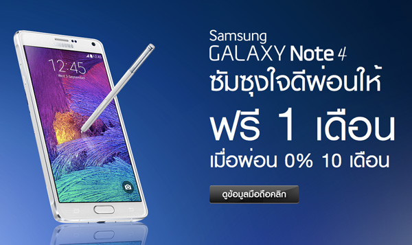 นอกจาก Samsung Galaxy Note 4 แล้ว ยังมี Samsung Galaxy Note 3 ทั้งรุ่น LTE และรุ่น 3G เข้าร่วมรายการด้วยเช่นกัน รายละเอียดเพิมเติม https://www.samsung.com/th/promotion/galaxynote4/